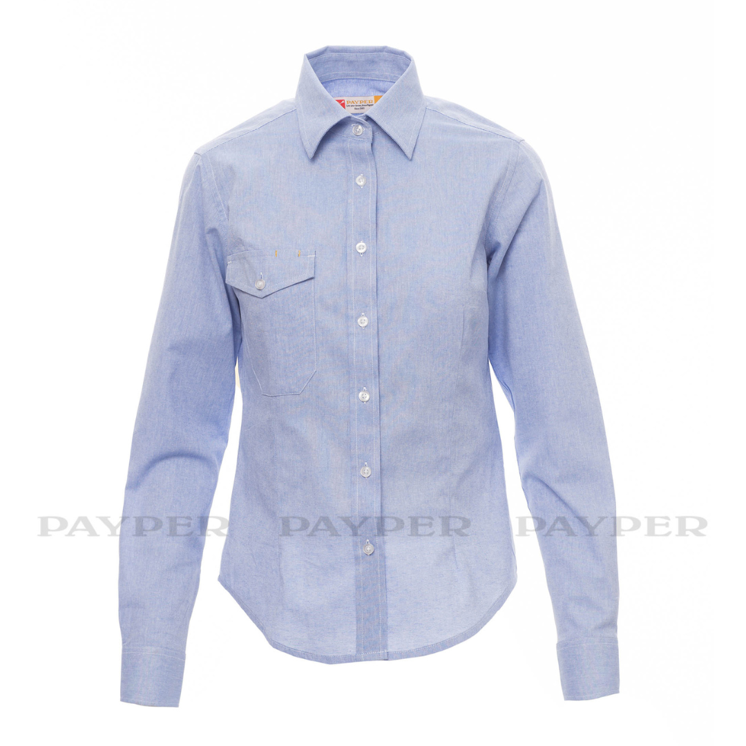 Camisa para mujer con corte entallado, pinzas en la parte delantera y trasera, cuello modelo italiano, puños perfilados con dos botones y un ojal, parte delantera con nervura cosida a la vista y botón a juego. Un bolsillo técnico en el pecho cerrado con tapeta con botón y dos ranuras para bolígrafo. Parte trasera con canesú y pinzas.