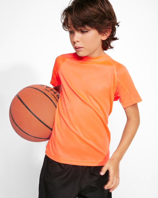 Camiseta técnica de manga corta ranglán. 100% poliéster.